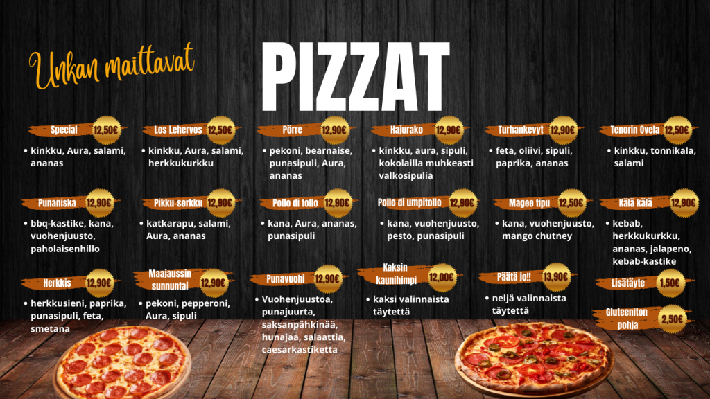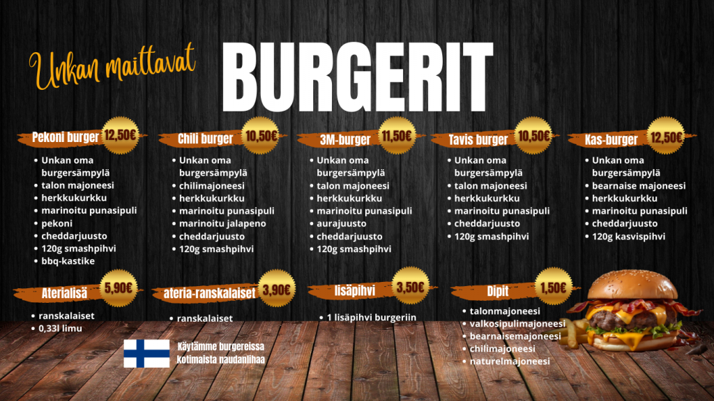 Tervetuloa Unkan baariin herkuttelemaan. Meidät tunnetaan maukkauista munkeista, possoista, lihiksistä sekä muista paikanpäällä leivotuista herkuista. Facebook Instagram TikTok Sähköposti +358 19 355 110